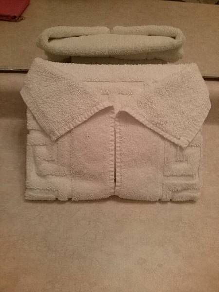 浴室裡折成衣服狀的毛巾